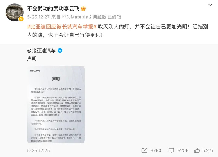 诶,这句话一出来,大家是不是就有印象了?没错,这就是在5月25日长城汽车举报比亚迪之后,比亚迪的高管转发微博回应时所搭配的内容,不得不说,这真的是太过于巧合了。