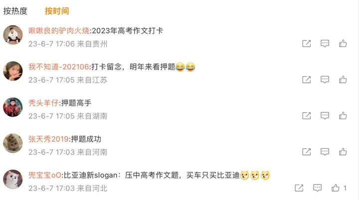 随之“比亚迪押题成功”也冲上热搜,比亚迪高管李云飞的微博评论区也迅速沦陷,不少网友都表示其对于比亚迪的“崇拜”,甚至有网友调侃称:“押中高考作文,买车只买比亚迪(狗头)”。