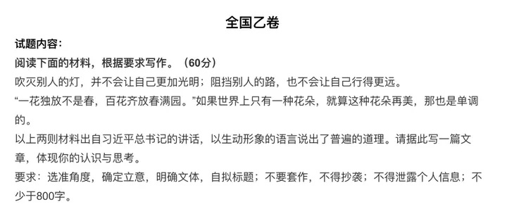 6月7日,全国高考正式拉开帷幕,数百万考生走进考场,迎接人生的一次重要考验。每年的高考语文题目无一例外都是微博的热搜,而今年全国乙卷的作文题目里,出现了一个非常有趣的内容,那就是“吹灭别人的灯,并不会让自己更加光明;阻挡别人的路,也不会让自己行得更远。”